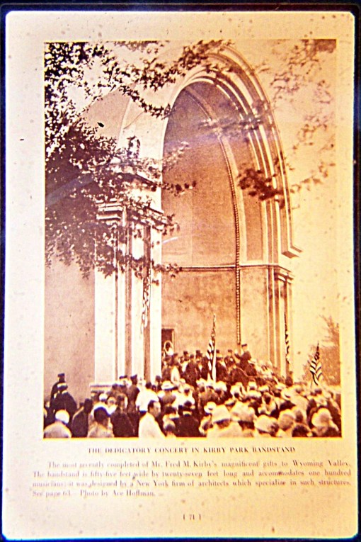 This is a picture of a slide with the caption: “The most recently completed of Mr. Fred M. Kirby’s magnificent gifts to Wyoming Valley. The bandstand is fifty-five feet wide by twenty-seven feet long and accommodates one hundred musicians. It was designed by a New York firm of architects which specializes in such structures. See Page 63 (Note: I don’t know of what) Photo by Ace Hoffman.” —-Luzerne County Historical Society Archives.