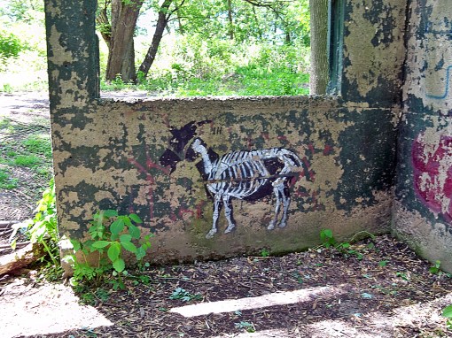 In conversations with other people who I have run into while walking along the trail here, this is the remaining structure that seems to capture the imagination the most.  Several people have told me that they thought it was the remains of the bear habitat or the monkey house because of the little tunnel system/walk way that runs underneath the structure.